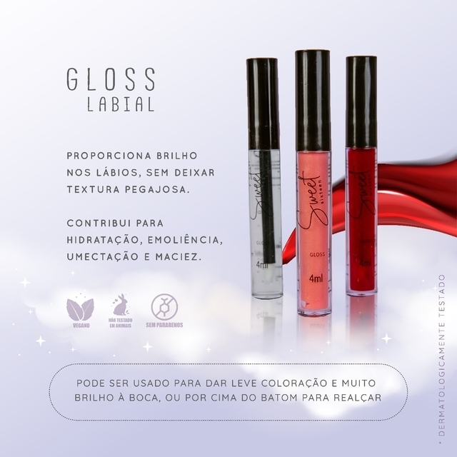 O Gloss da Sweet Sixteen foi desenvolvido para proporcionar brilho nos lábios, sem deixar textura pegajosa. Contribuí para hidratação, emoliência, umectação e maciez. Pode ser usado para dar leve coloração e muito brilho à boca, ou por cima do batom para realçar.